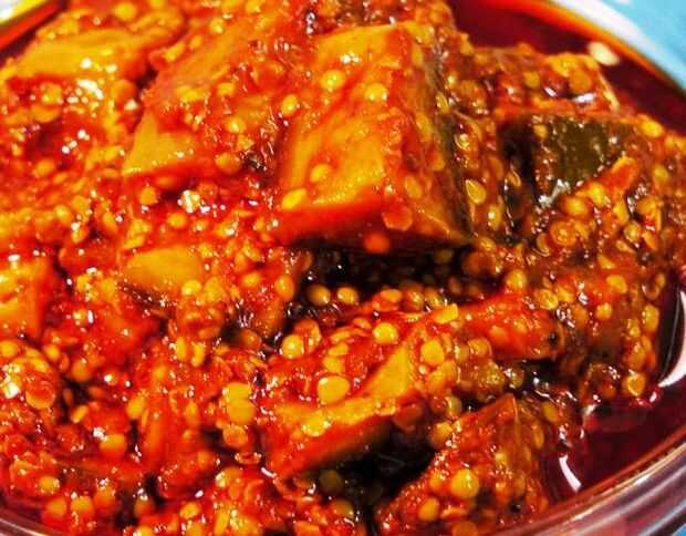 Encurtidos de mango es un pepinillo en cada hogar de la India o en cualquier toma de alimentos. Es muy sencillo de hacer pero es muy sabroso. Normalmente los mangos crudos están disponibles en los veranos; cada asimiento de casa toma orgullo en la fa