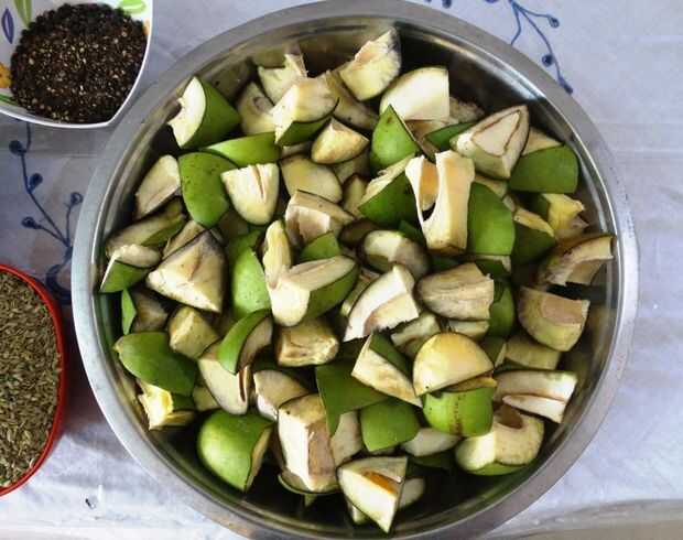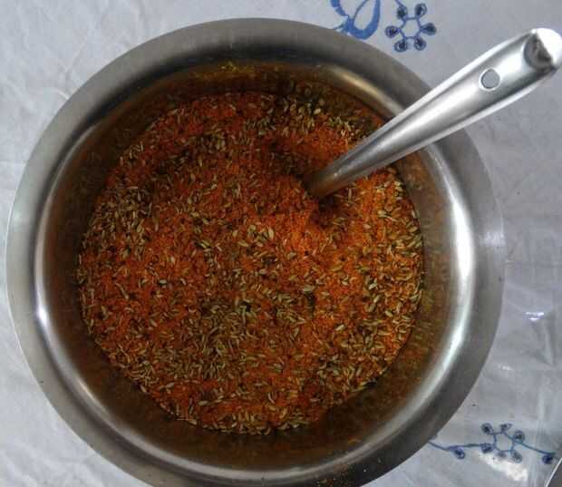 1 kg raw mango150 gm de dividir las semillas de mostaza100gm de dividir las semillas de alholvaPaso 1:semillas de hinojo 50 gm (tierra corasly)semillas de chernushki 50gm4 cucharaditas polvo de Chile rojo (Cachemira)Paso 2:2 cucharadas de cúrcuma1 ta