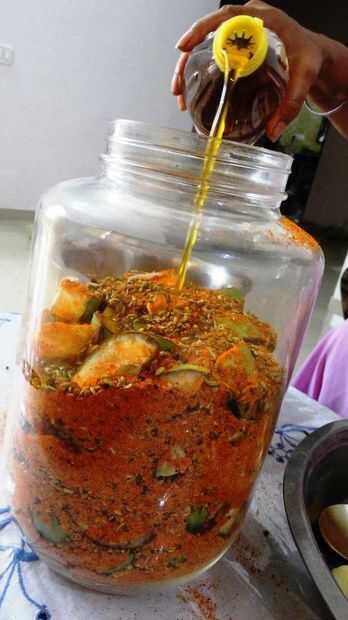 Encurtidos de mango es un pepinillo en cada hogar de la India o en cualquier toma de alimentos. Es muy sencillo de hacer pero es muy sabroso. Normalmente los mangos crudos están disponibles en los veranos; cada asimiento de casa toma orgullo en la fa