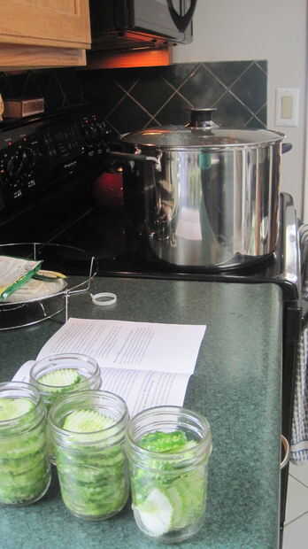 Llene los frascos con líquido de conserva en vinagre y pepinos. Deja sobre un 1/2 pulgada de espacio en la parte superior. Quitar cualquier aire de la jarra presionando sobre los ingredientes. Intente introducir un cuchillo por la parte del recipiente para liberar burbujas de aire. Sellar la jarra con la tapa. No apriete demasiado las tapas.