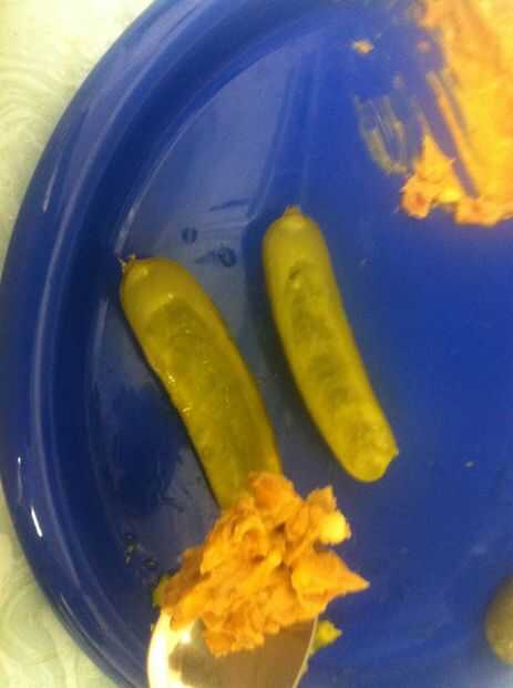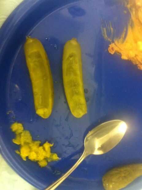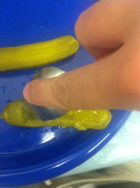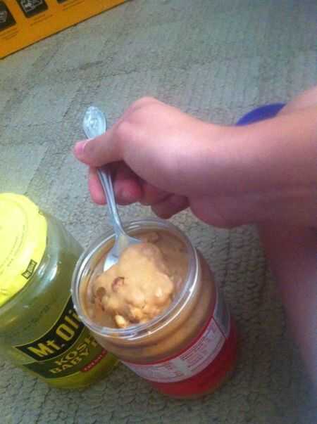 Puedes también conseguir una cuchara de mantequilla de maní y algunos encurtidos y tomar un bocado de cada uno. Saben exactamente igual.