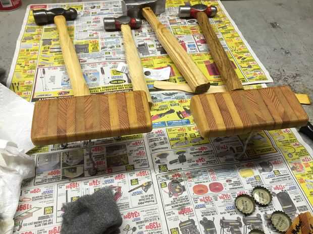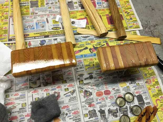 He leído que puede mojar arena poliuretano como un coche acabado y que pulir a un brillo bastante bueno. Esto fue bueno para mí porque por lo menos había hecho esto antes. Único problema era que sólo tenía hasta grano 1000 en el momento así que tendría que hacer. Practiqué con diferentes combinaciones de lijado húmedo con el grano 1000 y lana de acero fina mi manijas del martillo. Podría conseguir más brillo de la lana de acero y esmalte que el lijado húmedo pero realmente me encantó la sensación del lijado húmedo. Lo hizo mundos para suavizar, por falta de una mejor descripción, sensación plástica de una capa de poliuretano fresca.