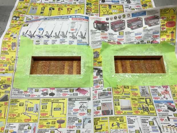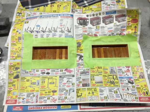 Tuve algún adhesivo en aerosol para uso automotriz. Hice una prueba de escurr con él en un corte fino de madera y un trozo de paño de corte de las piezas más grandes. Parece un gran trabajo así que me fui a enmascarar los casos que hacer con esta cosa! En este punto, sinceramente, yo había desarrollado una gran cantidad de desprecio para este proyecto y conseguía algo enfermo de mirarlo.