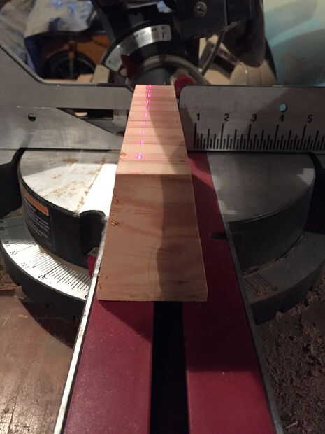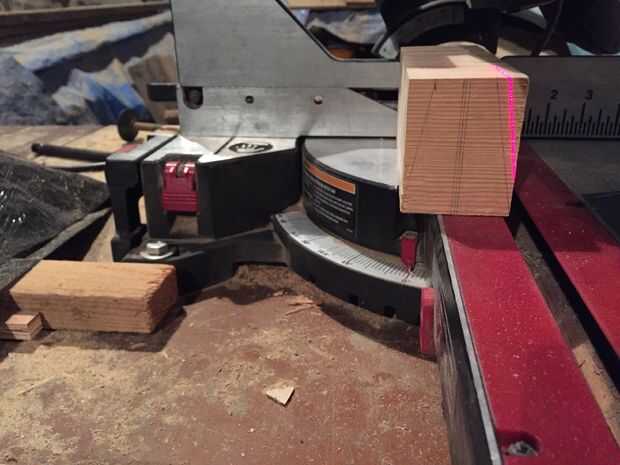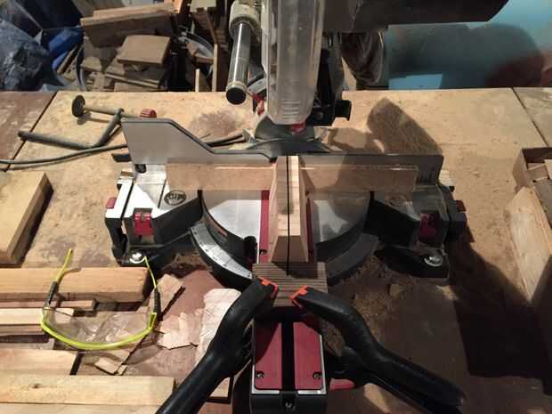 Finalmente me di cuenta que podía utilizar la función compuesta de mi sierra de ingletes para cortar el ángulo. Ambas sierras son 10", pero debido a que la sierra para cortar ingletes permite el eje para acercarse al material, la capacidad de corte es más. Ahora, esto es todo bueno y bien, pero que hace sostener el espacio en blanco durante el corte con seguridad muy difícil. Me las arreglé para conseguir el trabajo hecho con unas pinzas y un sólido respaldo proporcionan un asimiento de fricción como por presión con un palo de empujar. Me aseguré de hacer estos recortes muy, muy lentamente y siempre estar al tanto de todo.