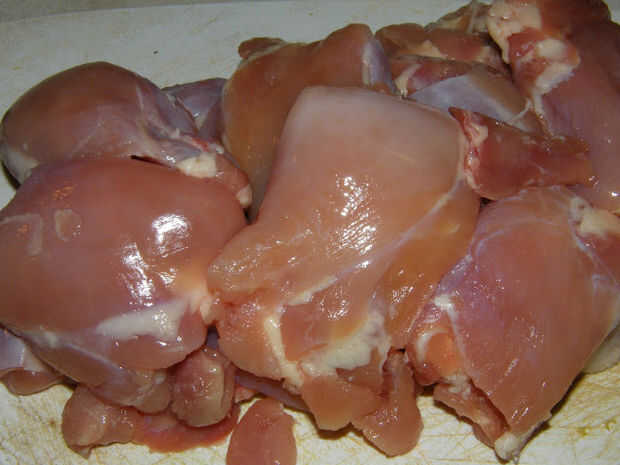 bastante pechuga de pollo sin piel, sin hueso (como 12 senos por lo menos) - cortado en trozos de 3-4 por mama