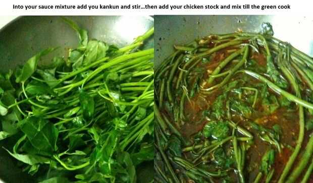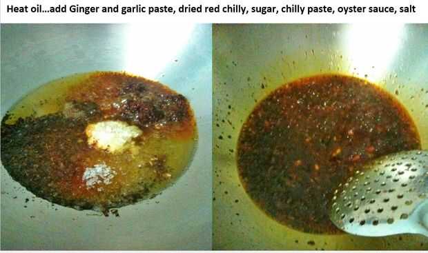 calentar el aceite... Añadir 1 cda jengibre y ajo, 1 cucharadita de sal, 1 cda secada rojo frío, 1 cda de pasta fría, 2 cucharadas azúcar, 3 cucharadas salsa de ostras, 3 cucharadas salsa de soja.