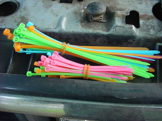una muy breve lista de insumos para este proyecto, necesitarás zipties, un cuchillo de razorblade o sharp, un vehículo que necesita arreglando debajo de la campana. Tengo un ford más viejo V6, su vehículo puede requerir más o menos zipties según su motor