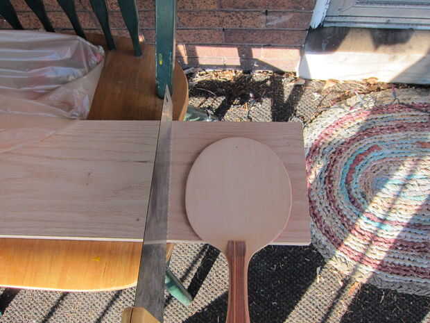 Usar la pala de tenis de mesa como una plantilla para lo plano primero.  Traer los dientes-cosa de metal gigante al roble.  No corte la pala!  Cortar el roble en su lugar.  Usted decide que sería bueno dejar algo de espacio en los lados para que su palo se sentirá menos desnuda.