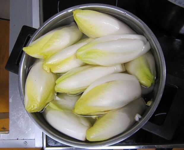 Cocer las endibias en agua con un poco de sal casi cocinado y luego escurrir las hojas de achicoria