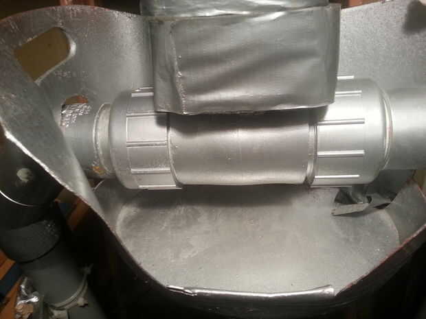 La guarnición de la compresión de hombro es una T con una derivación central roscado. La columna de diámetro más grande se conecta al centro del hombro T con un acoplador reductor roscado. Elegí un diámetro más grande para las caderas que no estaba disponible como una T. La hice en un T partiendo de un estándar, Re-Max T montaje longitudinal y pegar el lado de la T a la guarnición de la compresión. Este accesorio de compresión más grande de T se une a la parte inferior de la columna vertebral.