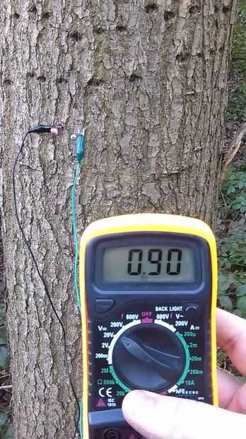 En la foto de puño puede verse que un árbol puede producir 0.9V, así que una combinación de 9 árboles producen aproximadamente 8V, suficiente para alimentar la placa Arduino. Todo lo que tiene que hacer es configurarlo. Usando el martillo, uno cobre y un zinc clavo es hamered en por árbol, en una separación de aprox. 5cm. Entonces usando los cables con pinzas cocodrilo unido al bien final, el cobre y el zinc clavos necesidad de estar conectado como se muestra en el diagrama anterior.