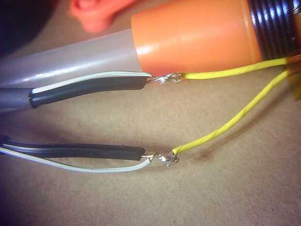 Tubería del encogimiento del calor se ha deslizado sobre los cables antes de soldar. Esto es necesario para evitar que los alambres tocando y poniendo en cortocircuito hacia fuera.
