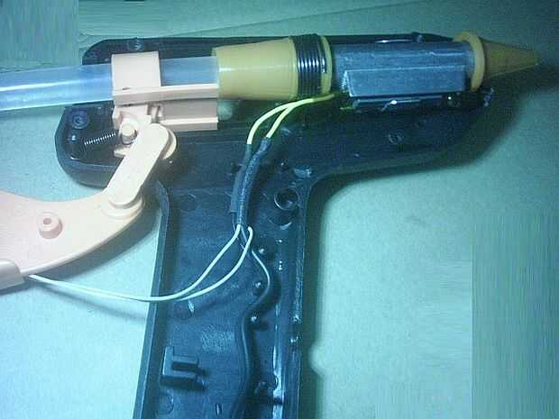 Las articulaciones se han cubierto en encogimiento del calor de la tubería, reducido uso de la llama de un mechero y el cable sustituido en su posición original. El mecanismo del gatillo se ajusta sobre esto, y lo de actuación no debería causar el cableado mover.