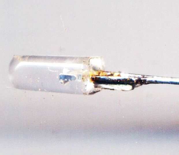 Las piezas de metal dentro del plástico transparente son visibles y servir como una guía para moler. Los electrodos del LED se mantienen en posición mediante este plástico transparente y también mucho se quita, el LED podría morir una muerte prematura.