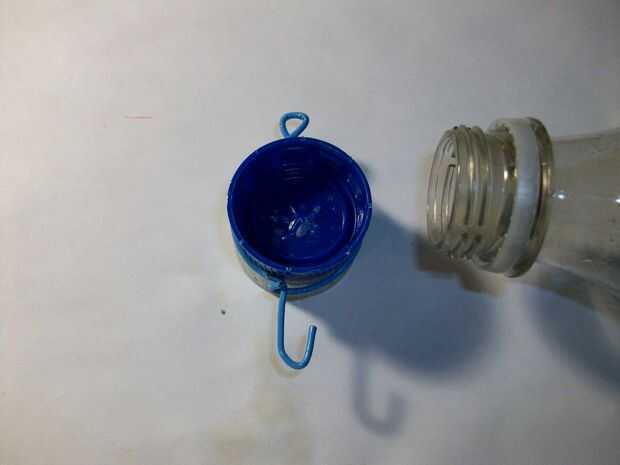 Enganche de alambre. Straiten hacia fuera los alicates de uso para envolver alrededor de la mitad de la tapa. Forma un gancho cerrado en el gancho superior y abierto en la parte inferior. Pegamento en su lugar asegurándose de que está orientada a que las botellas se colocan para coger el viento.