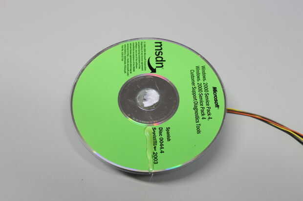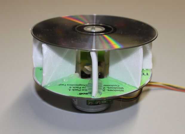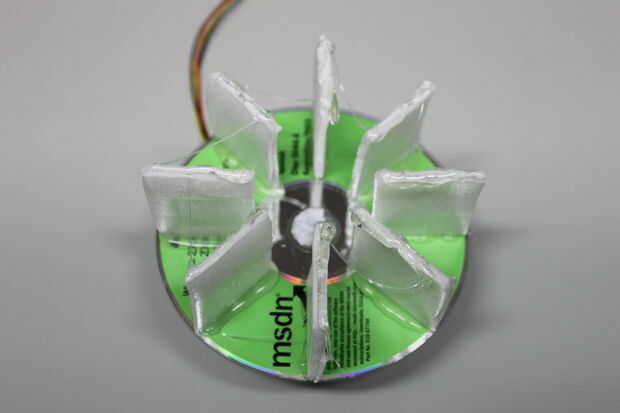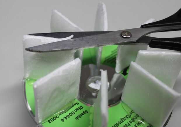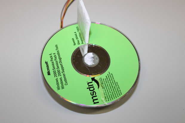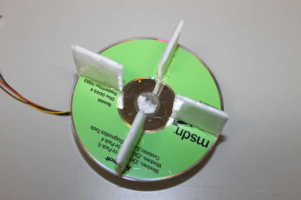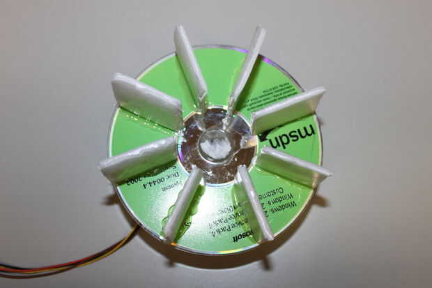 Algunas prácticas de prueba demostró a un segundo que CD-ROM en la parte superior es necesaria para hacer la construcción de la rueda de paletas bastante robusta. Cuando el pegamento ha fijado, Compruebe la "altura" de todas las paletas y cortar aquellas que son más largos que los otros. Todas las paletas Obtén poco de pegamento en la parte superior (en funcionamiento rápidamente) y el segundo CD-ROM se pone en la parte superior.