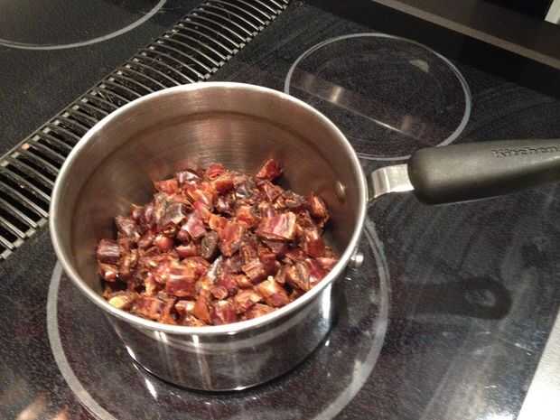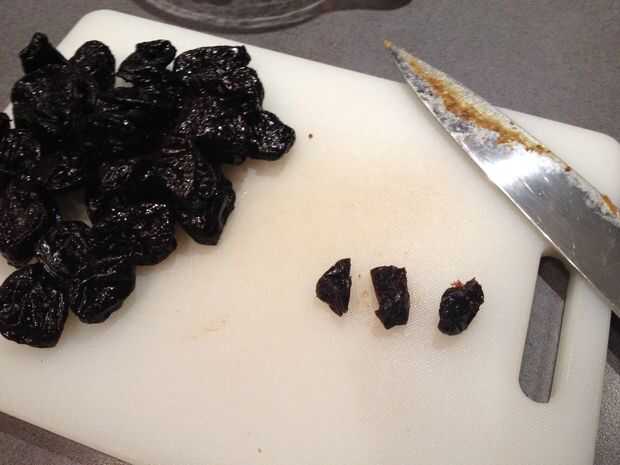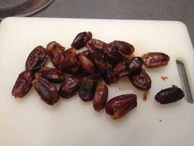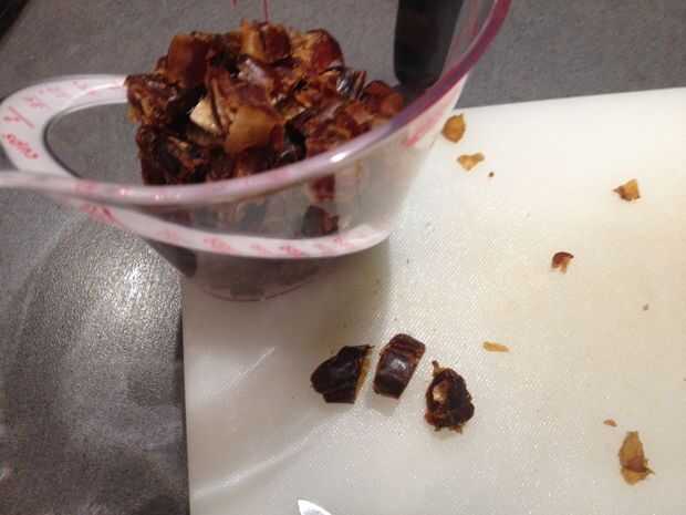 Cortar las fechas aproximadamente en tercios. Esto también ayuda a encontrar cualquier hoyos - fruta picada es generalmente procesada y aún puede contener hoyos.