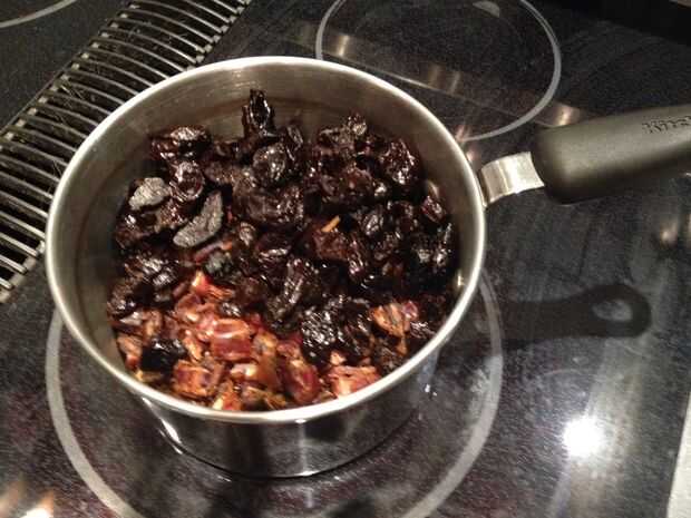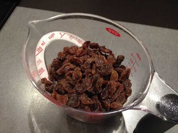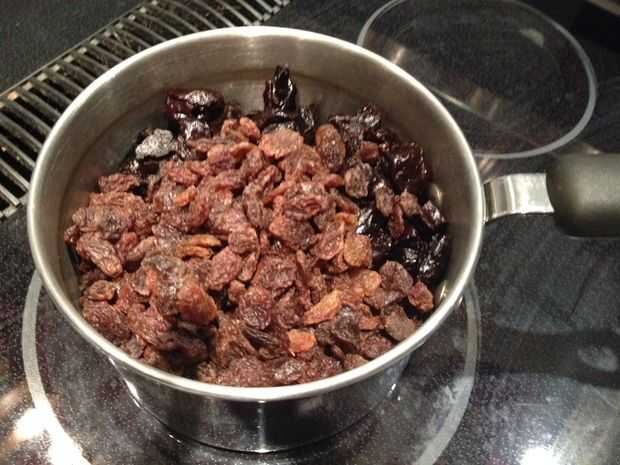 Cortar las uvas pasas... no, no cortar las pasas. Sólo vierta los todos en la cocina olla y añadir el agua.