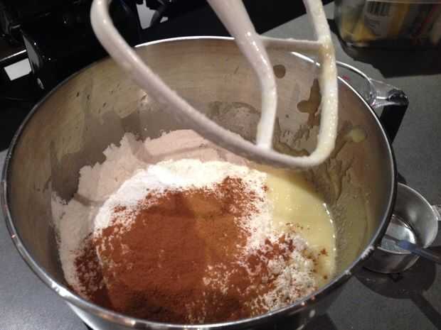 Añadir todos los ingredientes húmedos en, luego agregar en la seca - harina, canela y salvado de todo.