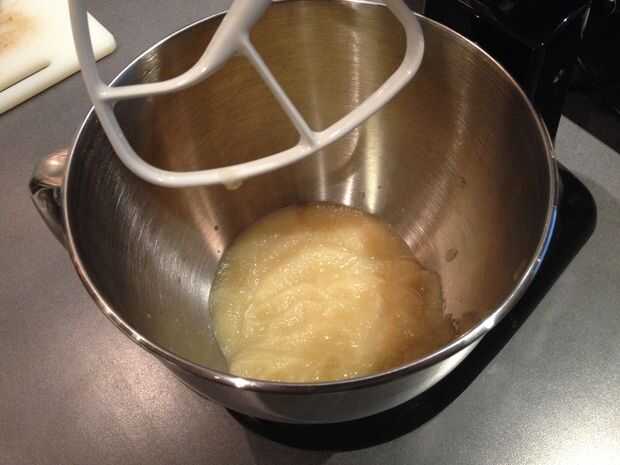 Empiezo añadiendo el aceite y puré de manzana en mi batidora. Una de las ventajas o triplicar la receta viene esa compota de manzana en frascos que son casi exactamente la cantidad correcta.