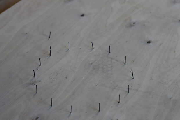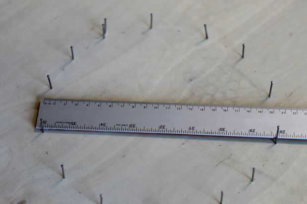 Martille clavos espaciados uniformemente alrededor del círculo. Para el círculo de 20 cm, utilicé unos 12 clavos y para el círculo de 40 cm, utilicé unos 16. En un punto en el círculo, usted querrá hacer una entrada de punto que pueda soportar el cable durante su principio de la primera bobina. En ese punto, martillo otro clavo cerca de un clavo, luego otra pareja pulgadas lejos.