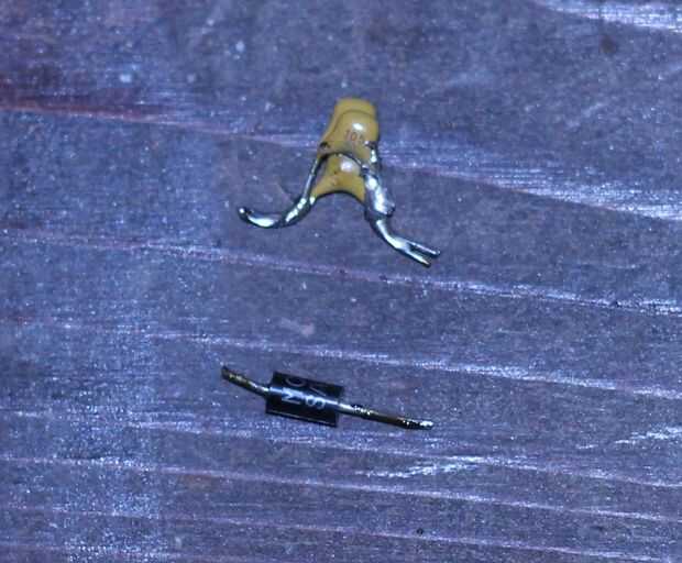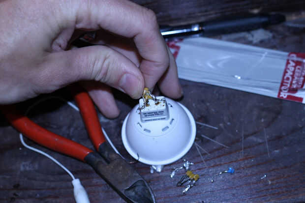 A continuación, vas a conectar la bombilla a la bobina pequeña. Necesita soldar tres 1uf (1 μF, o dicho de otra manera 1, 000nF) y un 0.47uF (dicho de una manera diferente, 470nF) condensadores a los postes de la bombilla. Que es un total de 3.47uF (condensadores suman en paralelo). Si estás haciendo la versión de alta potencia, también debe soldar 20V bidireccional diodo TVS entre la bombilla de luz puestos como protección contra las sobretensiones.