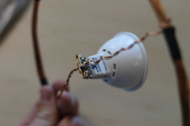 Luego le coloque la bombilla en el centro del alambre trenzado. Te separe los giros, para que cada conductor toca una terminal de la bombilla. Después raspar el esmalte del alambre con un cuchillo y luego suelde el cable limpio a los postes de la bombilla. Asegúrese de que utilizar soldadura de núcleo de resina. Puede añadir resina extra, que le ayudará a limpiar los trozos de esmalte.