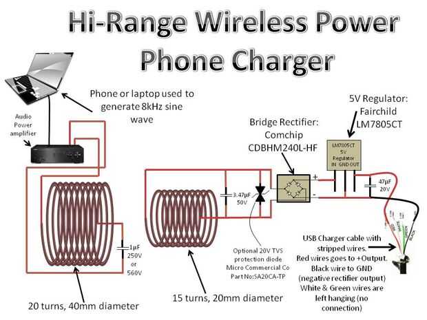 Puede modificar fácilmente el circuito para cargar un teléfono. Había construido una segunda bobina de 20cm y luego todos los circuitos. El mismo 3.47uF condensador y televisores de diodo se utiliza. Es seguido por un puente rectificador (Comchip P/N: CDBHM240L-HF), seguido de un regulador lineal 5V (Fairchild LM7805CT), seguido por un condensador de tantalio 47uF. Con un amplificador de alta potencia, el circuito puede cargar fácilmente su teléfono a una distancia de un pie y medio!