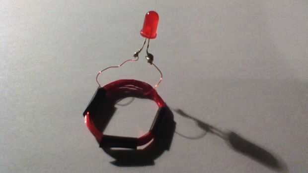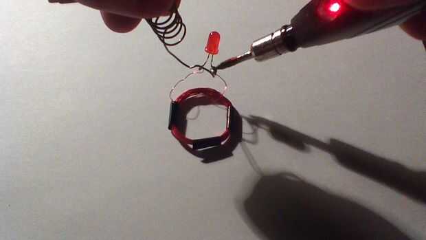 El LED será soldado a los dos cables de la bobina del receptor. Esto permite que el LED a ser accionado fácilmente cuando la bobina del receptor se mueve alrededor del campo magnético. Cada terminal del LED se conectará a uno de los cables de la bobina del receptor. El positivo y el negativo del led no importa, está cambiando la corriente en el receptor.