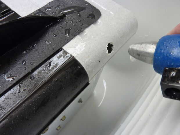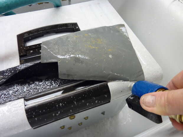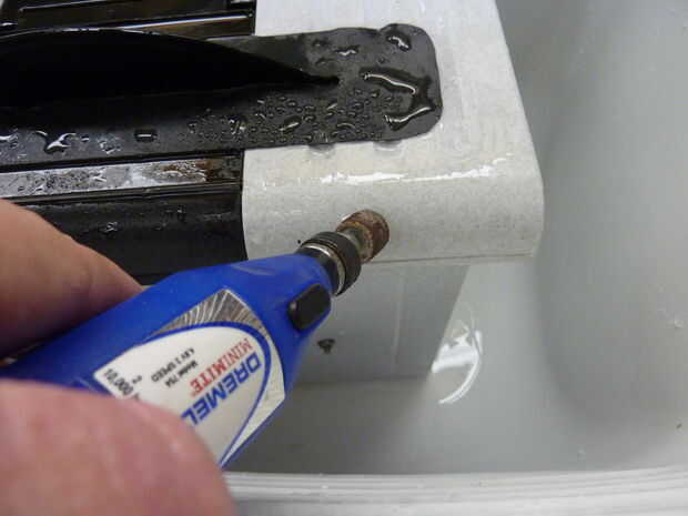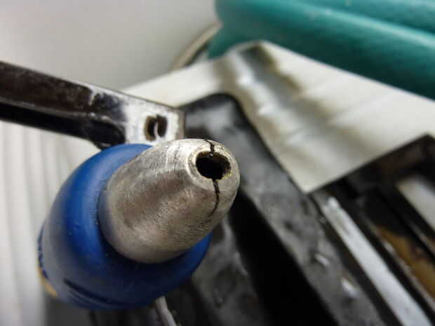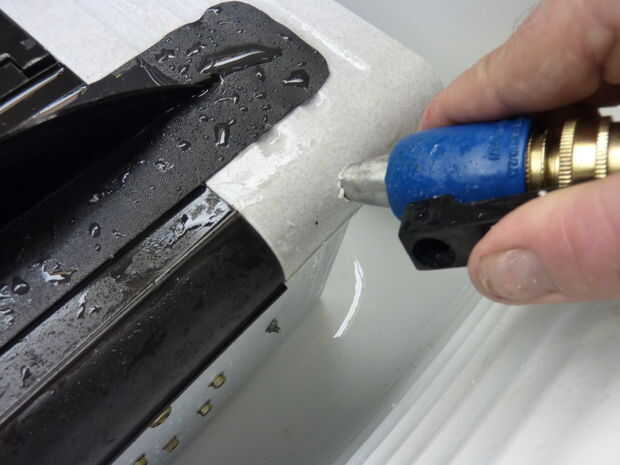 La segunda foto muestra un rociador de jardín barato que cavé de mi nave, que yo he modificado un poco. En primer lugar, he extendido el mango por epoxying un pedazo de plástico sobre ella. Esto me permite mantener el pulverizador y controlar fácilmente la cantidad de agua que tiraba hacia fuera con una mano. También he intentado reducir el tamaño del orificio de salida por golpear punta del pulverizador con un martillo. Funcionó hasta cierto punto, y luego divide el aluminio. Esto no fue un completo desastre, ya que la corriente de agua ahora se separa un poco, cubriendo más de la superficie acanalada. Mismo agujero del tamaño, forma... Tipo de me gusta.