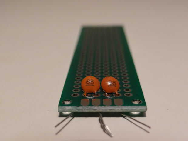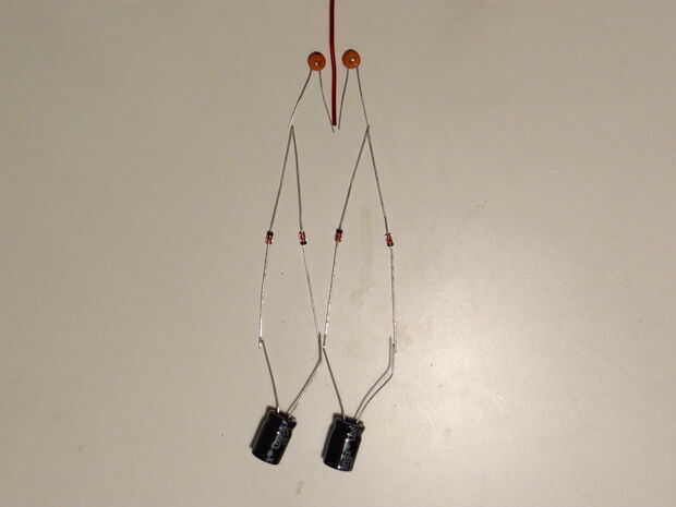 A cada uno de estos conductores de los dos condensadores en serie, se conectan dos diodos de cristal, uno hacia cada dirección, para formar lo que se llama un puente rectificador. Un puente rectificador es una configuración que convierte una corriente alterna a una directa por redireccionar inteligentemente la señal.