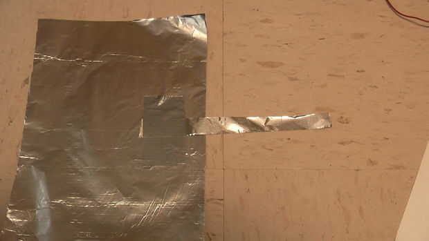Cinta de la tira de la hoja a la pieza grande de papel de aluminio que actúa como un plomo, asegúrese de que se toquen las láminas de aluminio.