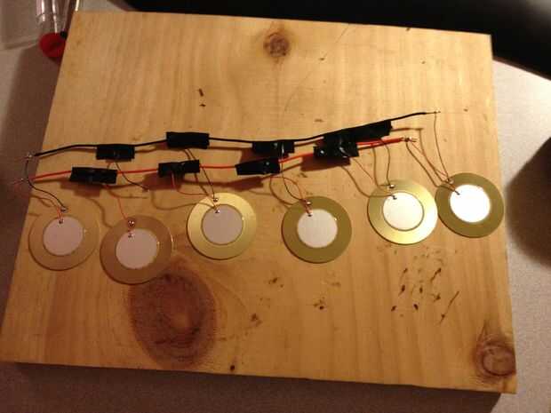 Fue encontrado ser mucho más fáciles de soldar 3 elementos entre sí en un momento, dejando 6 grupos de discos conectados en paralelo. Luego de la soldadura de estos grupos en parejas, dejando a tres grupos de seis discos piezoeléctricos. Ponen estos tres grupos como se aparecen en la placa base, y luego soldarlos juntos. Por último, soldar dos cables más al final del circuito del disco. Estos serán los cables de salida para el circuito de carga. Tenga en cuenta que los cables de los discos son muy frágiles y se rompen con mucho tirón. Ten cuidado, de allí será un montón de alambre decapado y volver a soldar para hacer.
