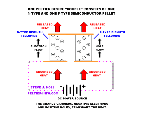 Dentro de la Peltier placas son muchos semiconductores de pares, los dos semiconductores se colocan térmicamente paralelo pero eléctricamente en serie. Los dos semiconductores (generalmente denominados "P" y "N") tienen densidades del electrón diferentes (la medida de la probabilidad de un electrón está en una posición determinada, mayor la densidad, los electrones más y la mayor probabilidad de golpear a uno), esta diferencia hace que electrones en los semiconductores P a fluir junto con el calor, permitiendo a los electrones a fluir contra él en el N. Esto genera una corriente eléctrica como el calor atraviesa el Peltier.