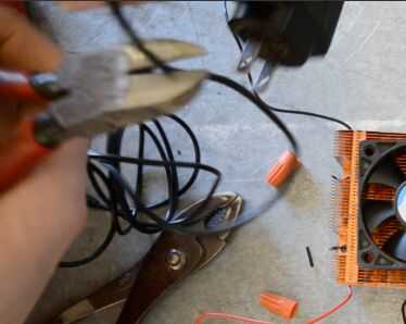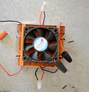 Parte 1 - observar el esquema anterior, cortar y pelar los cables entre las placas Peltier y entre las placas Peltier y el ventilador entre 1" y 2" de longitud. Dejar los conductores al regulador de voltaje en longitud total y solo Pele los extremos de los cables.