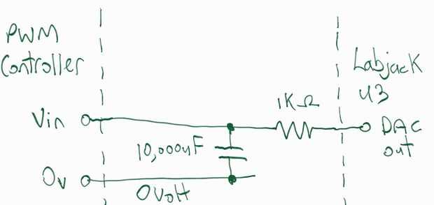 Quería arranque suave y parada suave para evitar un chorro de agua de un grifo abierto y también para reducir el desgaste de arranque en mi bomba/motor. En el croquis adjuntado, había incluido un resistor y un condensador entre la entrada de control del controlador pwm y la salida DAC de mi labjack u3. En cualquier momento solicitar a la bomba para encender, rampas gradualmente para arriba en un período de 8 segundos para entregar el caudal. También cuando soliciten para apagar sus rampas. Muy muy chulo!