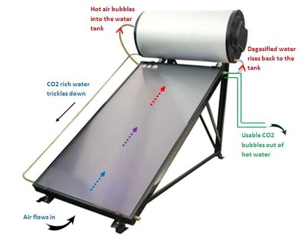 Los ricos de CO2 agua luego hilos hacia abajo los tubos de vidrio inclinada donde es calentado por el sol y se levanta para arriba otra vez. En este proceso de calentamiento, la solubilidad del CO2 disminuye drásticamente y las burbujas de gas hacia fuera. En este punto puede ser aprovechado y utilizado.