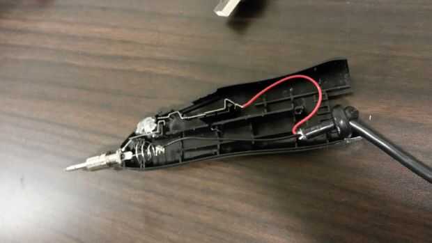 Se atan las fotos de la modificación que hice para el soldador Weller con el cable USB que sale del borde inferior con un nudo en el cable para un alivio de tensión. También usé algunos Kapton cinta para sostener los cables hacia abajo al poner la caja en porque a veces el cable se enredó en el medio. Me mide 1,4 amperios pasando por el soldador. Creo que la razón por qué este soldador es más estable porque utiliza resortes simples para completar el circuito y no usar baratos piezas frágiles de PCB.