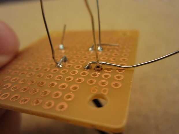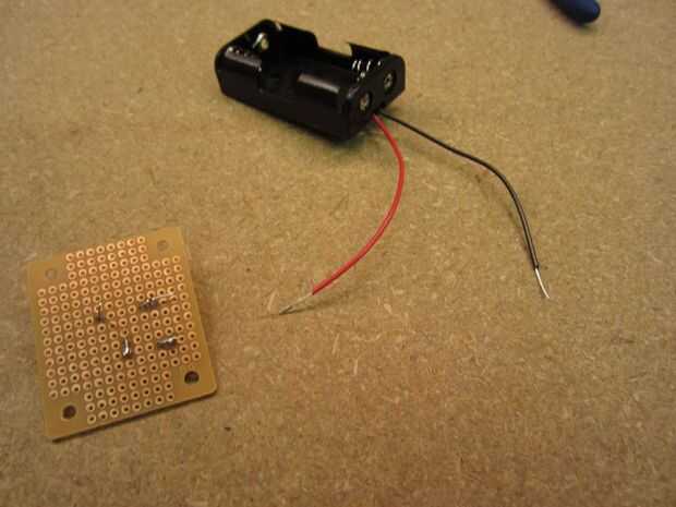 Tercera, soldadura en el soporte de la batería AA. Puede ser útil cortar algunos de los cables. También me gusta a mi los cables a través de agujeros de una tabla de perf. Esto alivia la tensión y evita que los cables de última hora.