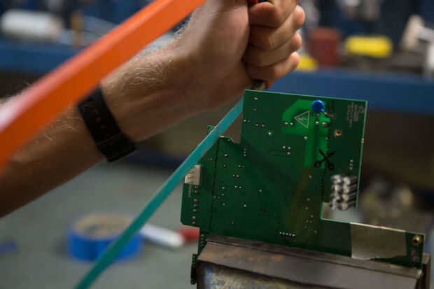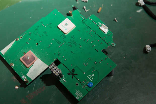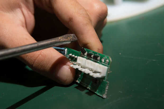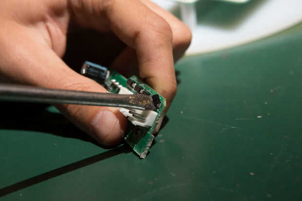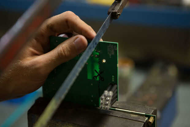 Use la sierra para recortar el área marcada en la placa de circuito. Tenga cuidado de no dañar los LEDs de cualquier condensadores mientras cortar el tablero de circuito. Trate de evitar tocar cualquier contactos expuestos en el circuito. (Foto 4, 5, 6, 7)