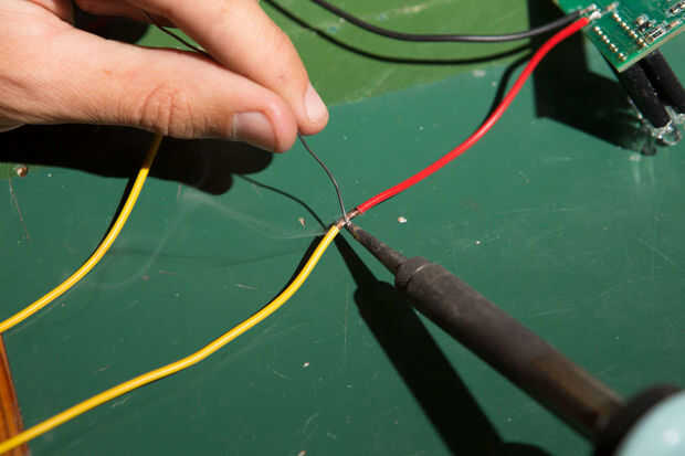 Paso 15 - la soldadura de los cables amarillos en el cable de alimentación de los LEDs.
