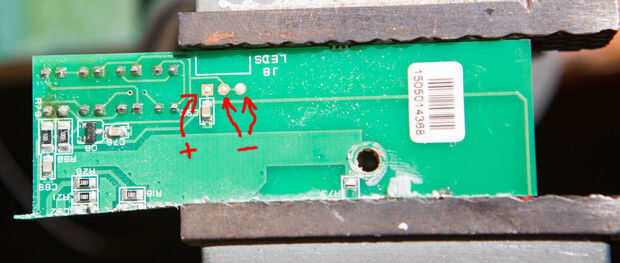 Este es quizás el paso más difíciles en el proceso. Si nos fijamos detenidamente en la parte posterior de la tarjeta de circuitos que se montan los LEDs en, usted verá tres pequeñas 'almohadillas' con un poco de soldadura sobre ellos.