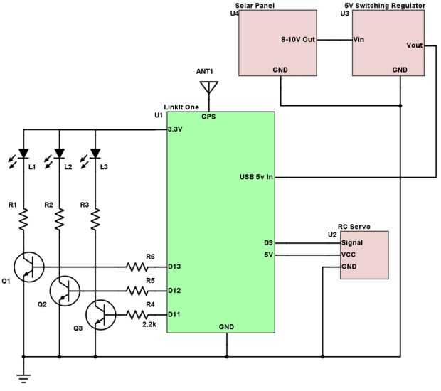 LinkIt uno puede sólo suministrar un par de mA a través de sus pines GPIO, así que usamos transistores para manejar los LEDS. Elegí un BC5468 pantano estándar con una resistencia de ohm k 2.2 en la base. Los LEDS verdes y amarillos rojos todos tenían una caída hacia adelante en la región de 1.65-1.75V, por lo que opté por resistencias de 90 ohm (ya que estaba usando el 3.3V carril para suministro).