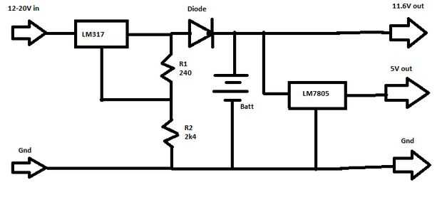 La energía es suministrada por 8 AA NiMh 2200mAh las baterías que se cargan a su vez por un 12v 1.5A panel solar. Las baterías están completamente cargadas de 1.45V por la célula o 11.6V total. Voltaje abierto en el panel solar indicado 22V en plena luz del sol, por lo que necesitaba para regular hasta mi tensión máxima de 11.6V. Esto fue lograda usando un regulador de voltaje LM317 con dos resistencias y había incluido un diodo. El valor de las resistencias varía algo como debe dar cuenta de una caída de 0.7V en el diodo. Creo que mis resistencias reales terminó siendo 240 y 2100.