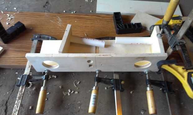 Taladrar los agujeros para los puertos. Comenzar con 7/8" forstner broca y perforar sobre a medio camino desde el interior. Con 5/8" bit taladro el resto a través de modo que el agujero más pequeño se centra en el más grande. Esto sólo debe hacerse a un lado y el orificio debe colocarse cerca de la parte superior y parte posterior.