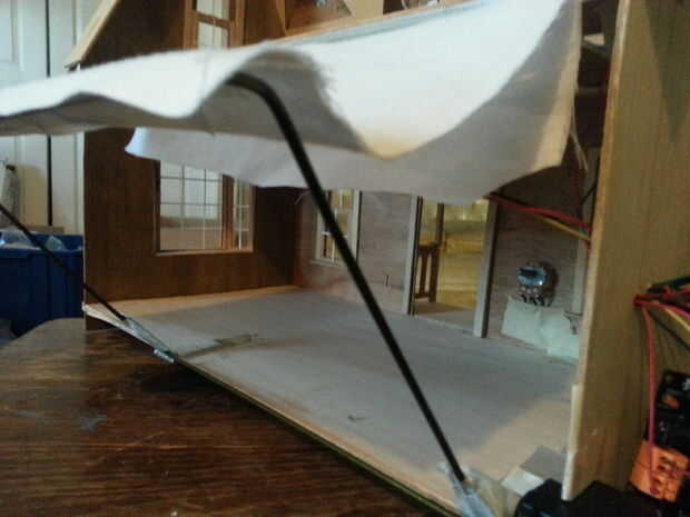 Con cero, agregue un deslizador de control de temperatura. Si la temperatura en la casa es superior a la temperatura deseada, el motor servo derriba la sombra. La sombra está hecha de una percha de alambre doblado en un rectángulo, se montaron en el primer piso de la casa con bisagras. Tela extra hizo la sombra de sí mismo.
