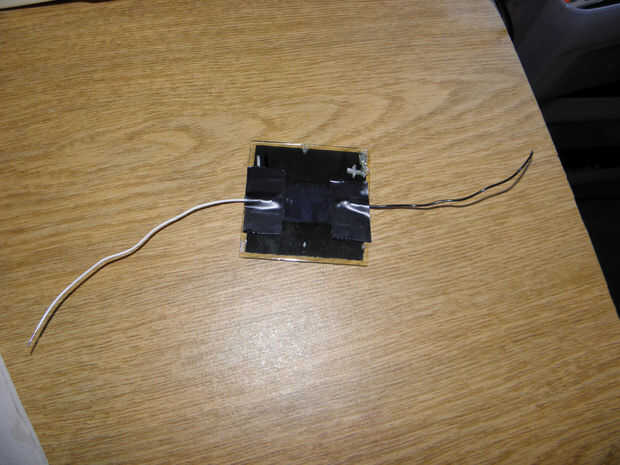 La soldadura de algunos cortos 4 pulgadas, cable trenzado, aislado con las pestañas delgadas a cada lado del panel. Tome nota de que lado es positivo y cual es negativo aplicando un metro a las pestañas mientras brilla la luz en el otro lado. Doble las lengüetas con los cables debajo del panel y use cinta aislante para asegurar los cables en la parte inferior del panel como se muestra en la foto.