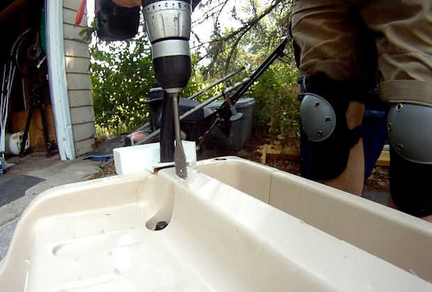 Haga agujeros en el cuerpo de plástico (5/8" espada cuchilla funcionado bien) justo encima de donde se conecta el bastidor.