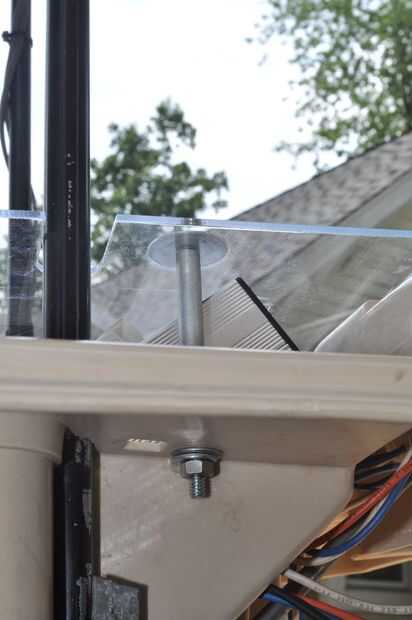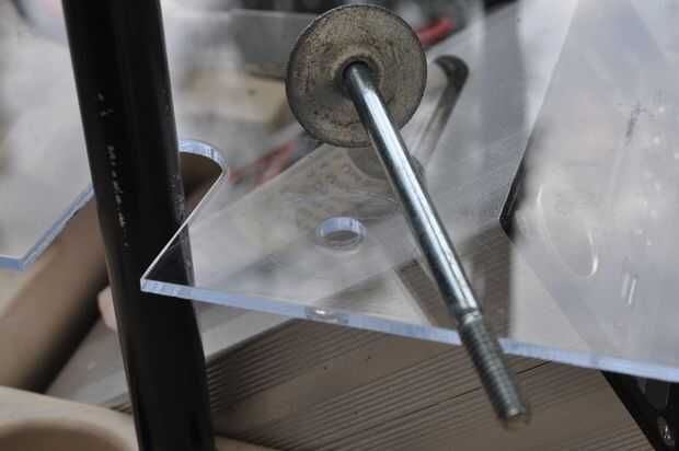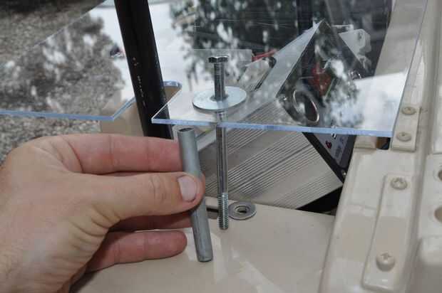 Siguientes, largos pernos pasan por una arandela de defensa, la cubierta de plástico transparente, el tubo espaciador de aluminio, una arandela, el cuerpo plástico, otra arandela y una tuerca nylock.