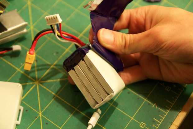 Este paso es bastante sencillo. Comience doblando las pestañas terminal de batería sobre en el área abierta encima de la batería. Usar cables cortos para conectar los terminales de la batería a los terminales protegidos en el PCM. Éstos se etiquetan generalmente con una B + y B-. Asegúrese de que los cables y PCM están contenidos dentro del espacio en la parte superior de la celda de LiPo, de lo contrario será difícil encajar en los modelos 3D.